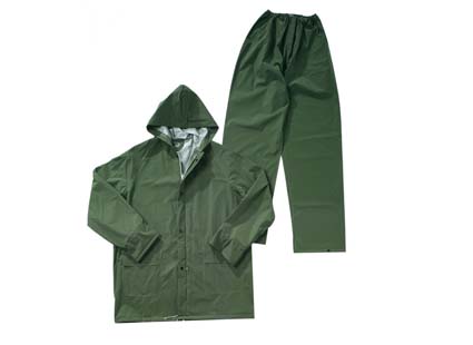 Traje de agua confeccionado en Poliamida / PVC. Chaqueta con capucha oculta y cierre de cremallera. Puños cortaviento. 2 bolsillos con tapeta en cintura. Pantalón con cintura elástica. Ajuste en bajos mediante corchetes. Costuras selladas.