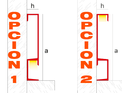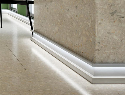 Este perfil es altamente polivalente y reversible. Puede colocarse, además de como rodapié, como remate intermedio o superior en la pared en dos posiciones distintas. Opcionalmente puede instalarse una tira de LED (no incluida) en cualquiera de los huecos interiores, pudiendo elegir entre una iluminación más discreta o más visible. En el hueco de mayor tamaño también puede colocarse una tira del mismo revestimiento, obteniendo un acabado totalmente integrado en la instalación.