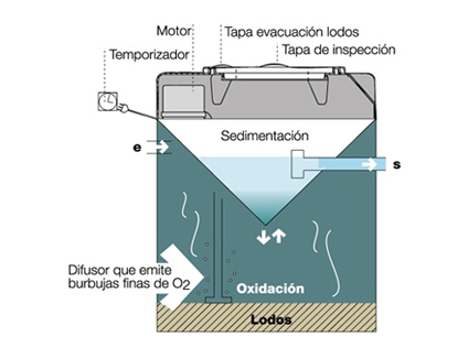 En un unico contenedor, en dos camaras distintas, se separan las dos fases de depuracion (oxidacion y sedimentacion)