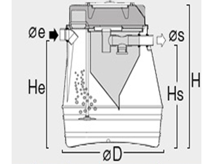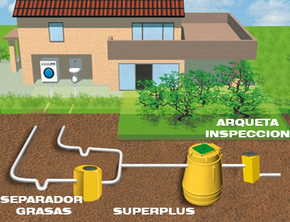 Recomendamos pretratar siempre las aguas residuales grises con un separador de grasas y instalar como mínimo una arqueta de inspección tal y como se puede apreciar en la imágen.