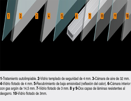- Cristal exterior templado con tratamiento autolimpiable. Protección contra daños por granizo. El vidrio interno está laminado para garantizar la seguridad en caso de rotura accidental.